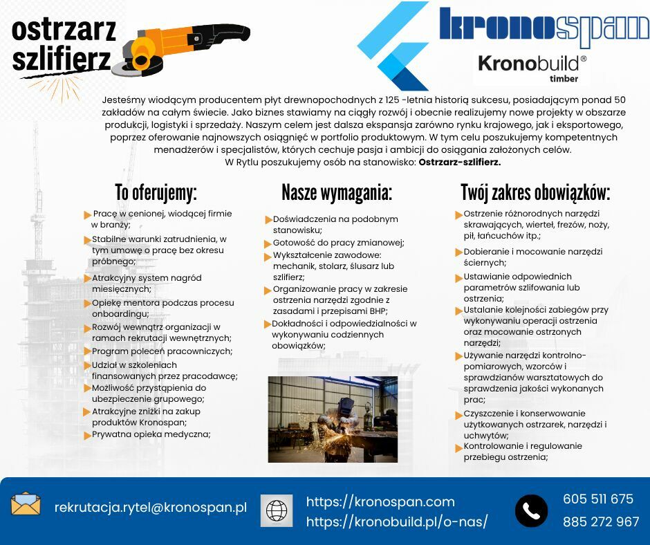 Twój zakres obowiązków:• Ostrzenie różnorodnych narzędzi skrawających, wierteł, frezów, noży, pił, łańcuchów itp.